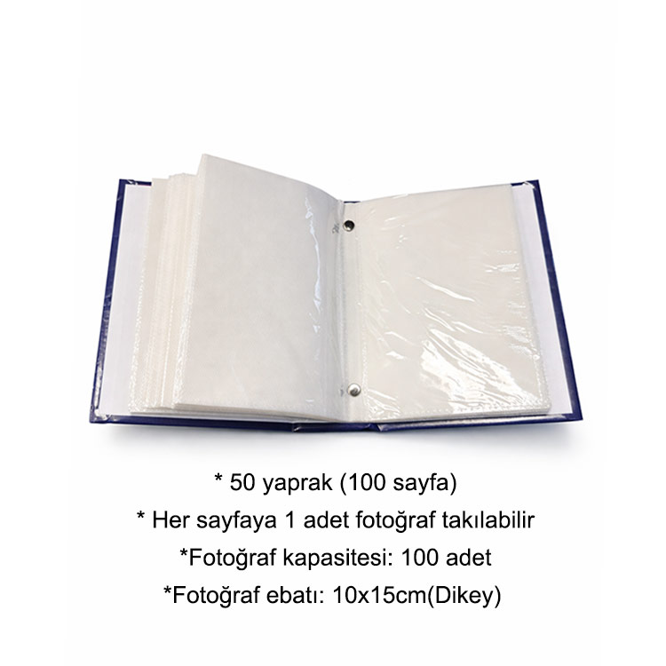 50 yaprak toplamda 100 sayfası bulunan 10x15cm ebatlarında fotoğraf takılabilen deri görünümlü fotoğraf albümü.