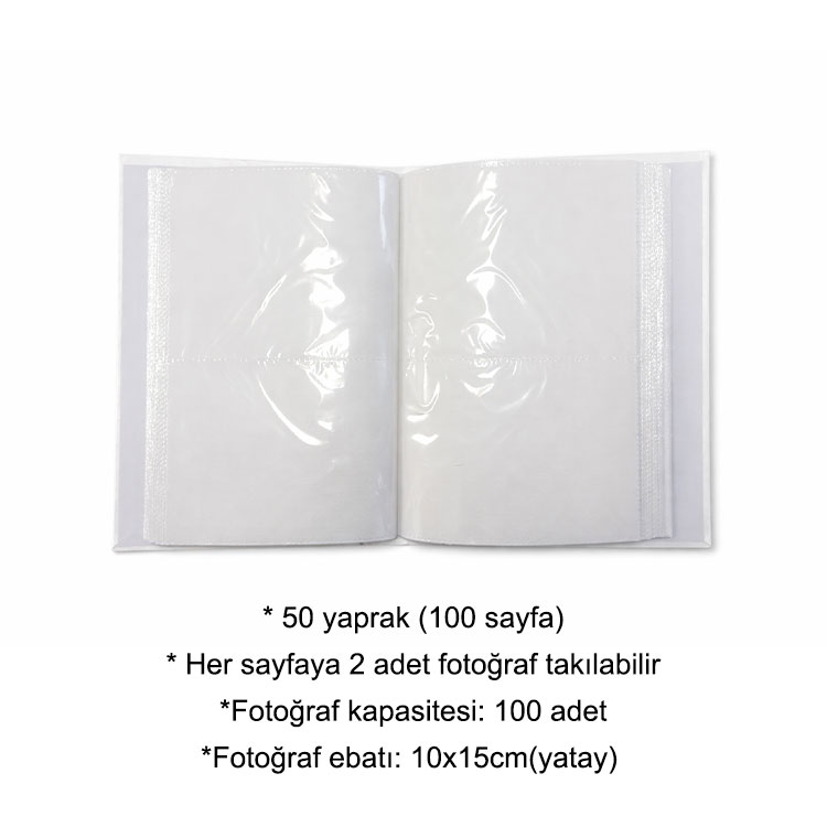 İçerisine 200 adet 10x15cm yatay fotoğraf koyulabilen, her bir sayfaya 2 adet fotoğraf yerleştirilebilen, pencereli deri fotoğraf albümü