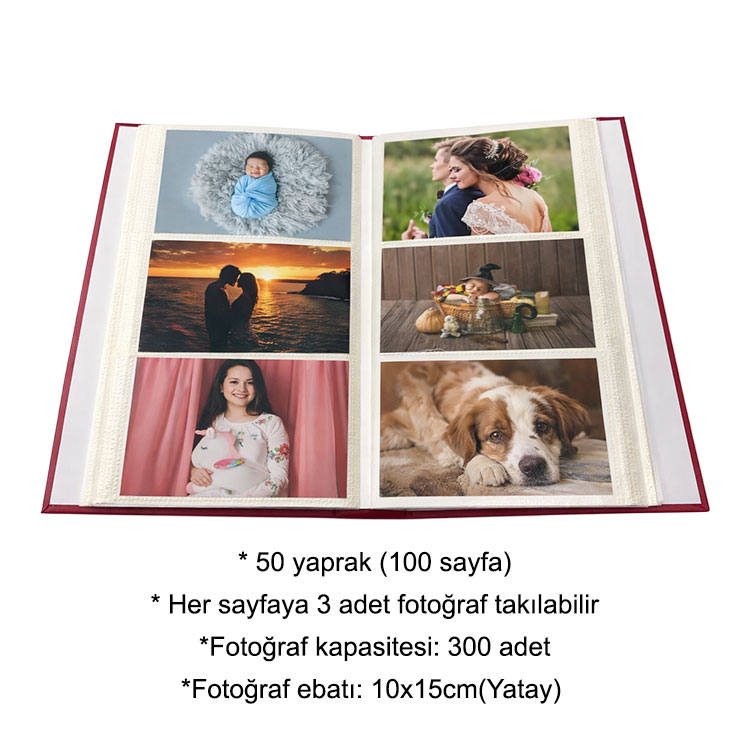 Her sayfaya 3 adet yatay fotoğraf yerleştirilebilen, toplamda 300 adet 10x15 cm boyutunda yatay fotoğraf kapasitesine sahip fotoğraf albümü. Bordo ve lacivert olmak üzere iki farklı renk seçeneği mevcuttur.
