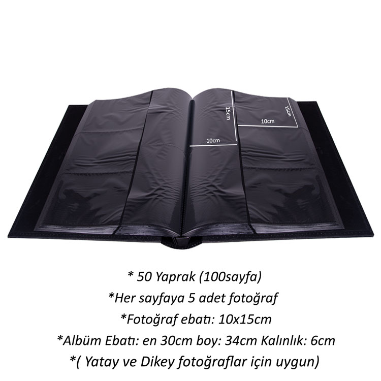 Deri malzemeden üretilen,10x15cm ebatlarında dikey ve yatay olmak üzere 500 adet fotoğraf alabilen, pencereli toptan deri siyah pencereli fotoğraf albümü.