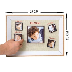 Kaliteli ahşap malzemeden üretilmiş, içerisinde fotoğraf koyulabilen 1 adet 10x10cm, 4 adet 4,5x4,5cm mıknatıslı magnet bulunan, kaliteli bir görüntü yaratan kendinyap fotoğraflı çerçeve.
