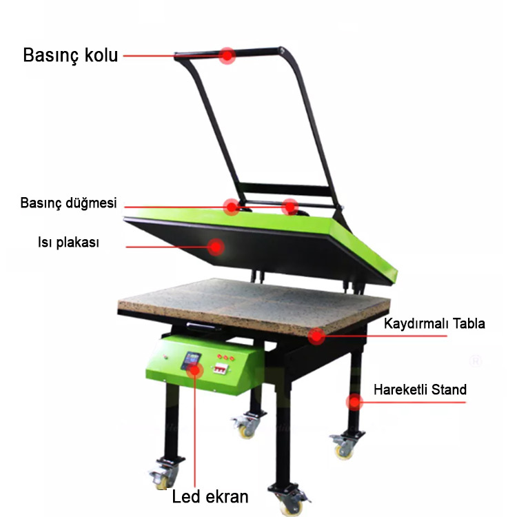 80x100 cm ebatlarında düz yüzeyli büyük boy ısı transfer işlemleri için kullanabileceğiniz transfer baskı makinesi.