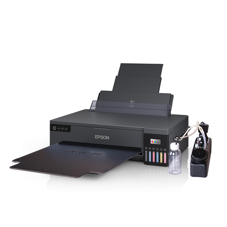 Özel olarak modifiye edilmiş Epson L18050 A3 ebatında tekstil baskı yazıcısı CYMK+ W (beyaz) mürekkepli, pet filme aynı anda hem renkli hem de beyaz çıktılar alarak koyu zemin, açık zemin farketmeksizin %100 pamuklu tişört, polyester kumaş ve penye, gibi düz yüzeye sahip tüm kumaşlara ve tekstil ürünlerine kaliteli baskılar yapabileceksiniz.
