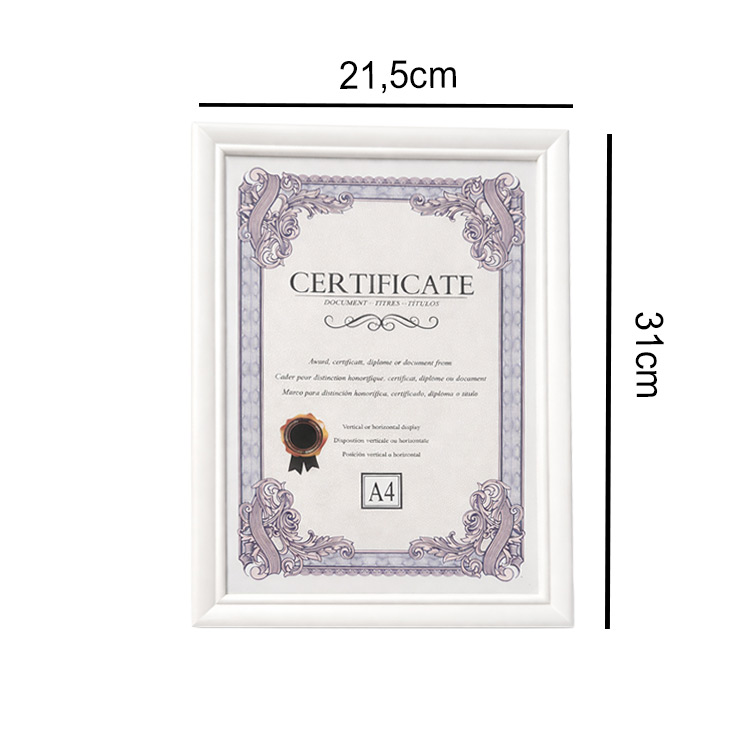 20x30 cm ölçülerinde diploma ve sertifikalarınızı düzenli ve şık bir şekilde sergileyebilmeniz için tasarlanmış, toptan plastik beyaz çerçeve.