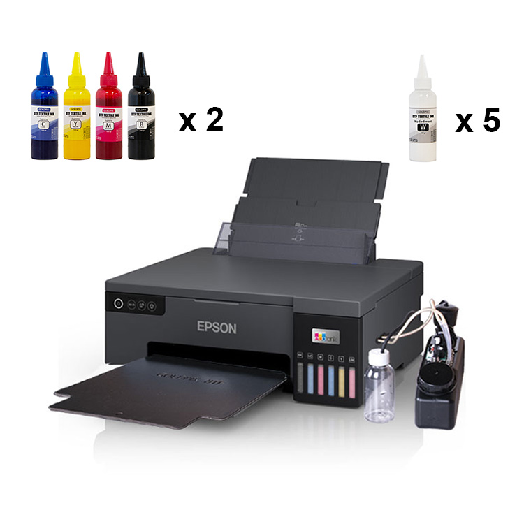 Özel olarak modifiye edilmiş Epson L8050 A4 ebatında tekstil baskı yazıcısı CYMK+W mürekkepli, pet filme aynı anda hem renkli hem de beyaz çıktılar alarak koyu zemin, açık zemin farketmeksizin %100 pamuklu tişört, polyester, kadife, kaşmir, penye, deri gibi tüm kumaşlara, motlara, kazaklara, t-shirt'lere ve akla gelebilecek her türlü tekstil kumaş ürünlerine kaliteli baskılar yapabileceksiniz.