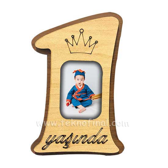 Kaliteli ahşap malzemeden üretilmiş üzerinde 1 yaş yazısı yazan ve taç kazıması olan 1 yaş magnet.