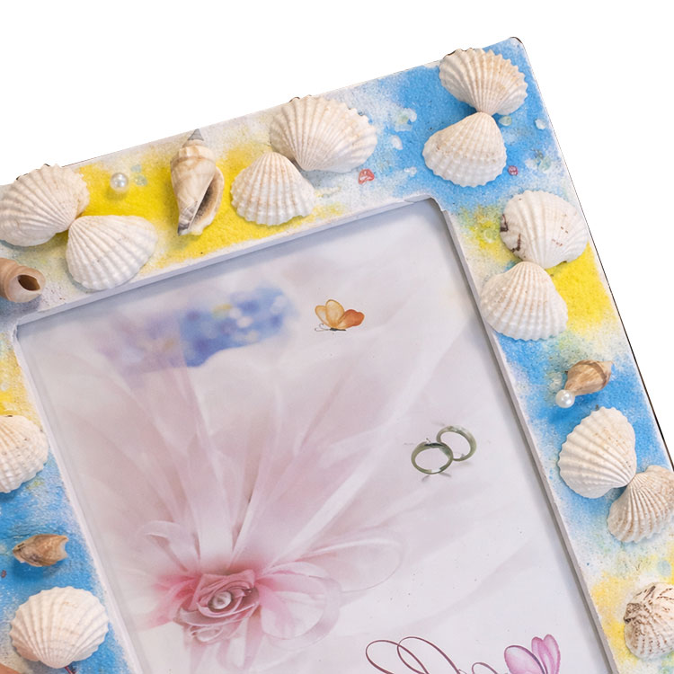 15x21cm ebatındaki fotoğraflar için uygun olan, sarı lacivert renkli deniz kabuklu toptan fotoğraf çerçevesi.