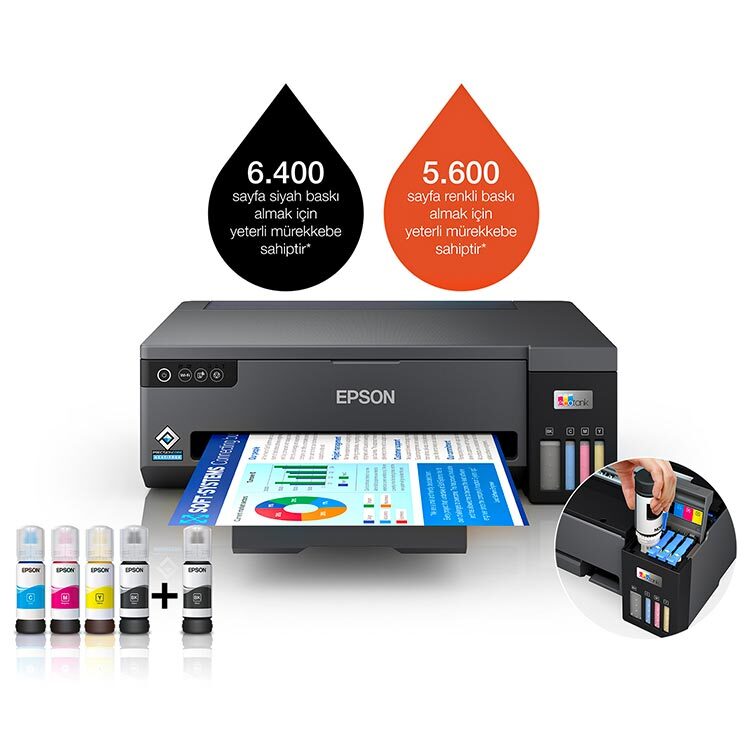 Ultra düşük sayfa başına maliyet, kablosuz ve mobil baskı ile bu kartuşsuz mürekkep püskürtmeli yazıcı, yüksek hacimli A3 ofis baskısı için mükemmeldir. L11050, yazıcı diğar yazıcılara göre siyah mürekkep haznesi daha büyük bu yüzden içerisinden 2 adet siyah mürekkep bulunmaktadır. yazıcının kompakt tasarımı, kilitli şişeleri ve daha kolay mürekkep dolumu için öne bakan mürekkep tanklarıyla alandan tasarruf sağlayan ve kullanımı kolay bir çözüm sunar.