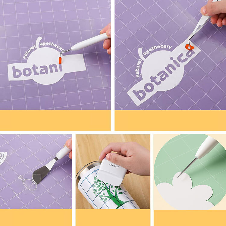 Folyo ve etiket Ayıklama Temel Alet Seti, vinil, folyo, flex, etiket kesim işlemleri için gerekli 5 parçadan oluşur: el işi makası, cımbız, sıyırıcı, spatula ve kesici oyma. Bu set, Cricut ve Silhouette gibi cihazlarla uyumlu olup el işi, dikiş, kesim ve kazıma gibi işlemlerde yüksek hassasiyet sağlar.