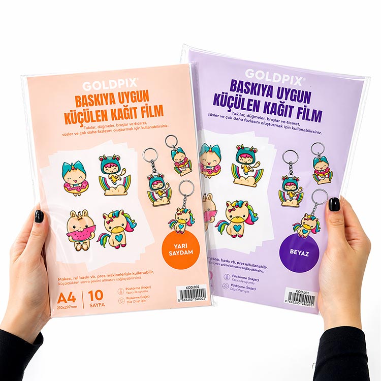 Dilerseniz yazıcıdan çıktı alabilir, dilerseniz kağıt film üzerine kendi çiziminizi yapabilirsiniz. Beyaz ve yarı saydam olmak üzere iki farklı seçeneği bulunan Goldpix Küçülen Kağıt Filmler.