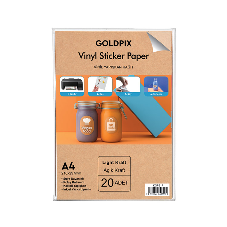 Kraft yapısı sayesinde ürünlere doğal ve şık bir görünüm kazandırır. Bu özelliğiyle hem dekoratif ürünlerde tercih edilen Toptan Goldpix İnkjet Yapışkanlı Kraft Vinil Sticker Kağıt,
