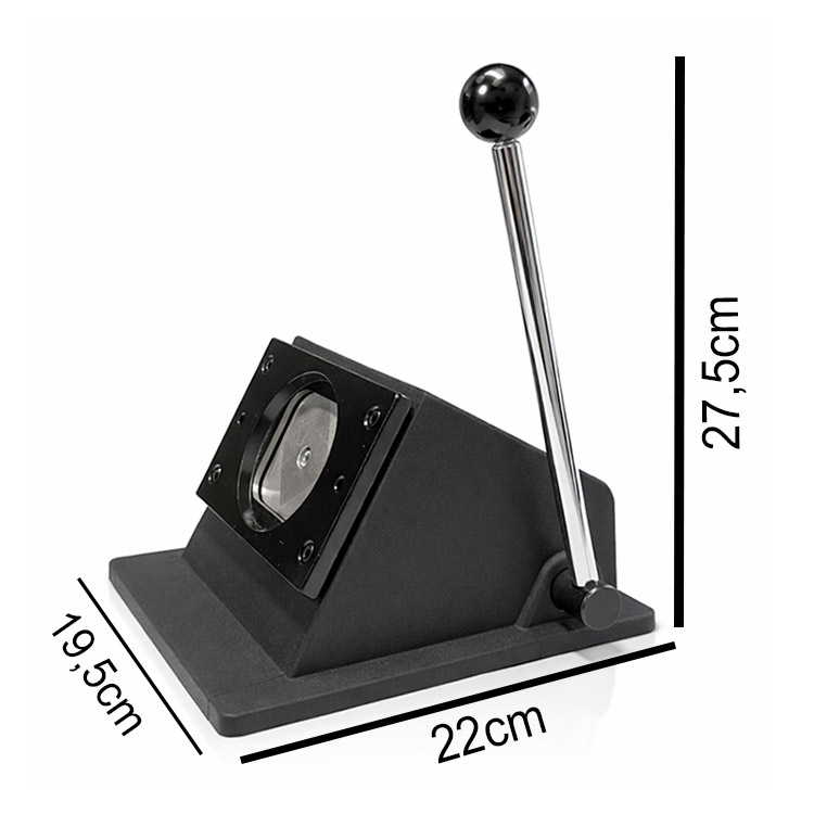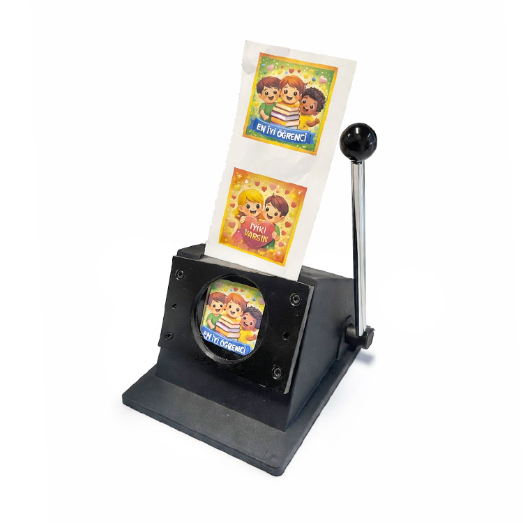 Buton rozet üretiminde, baskısı yapılmış kağıtların kare olarak kesilmesini sağlayan, toptan kare buton rozet kesim giyotini
