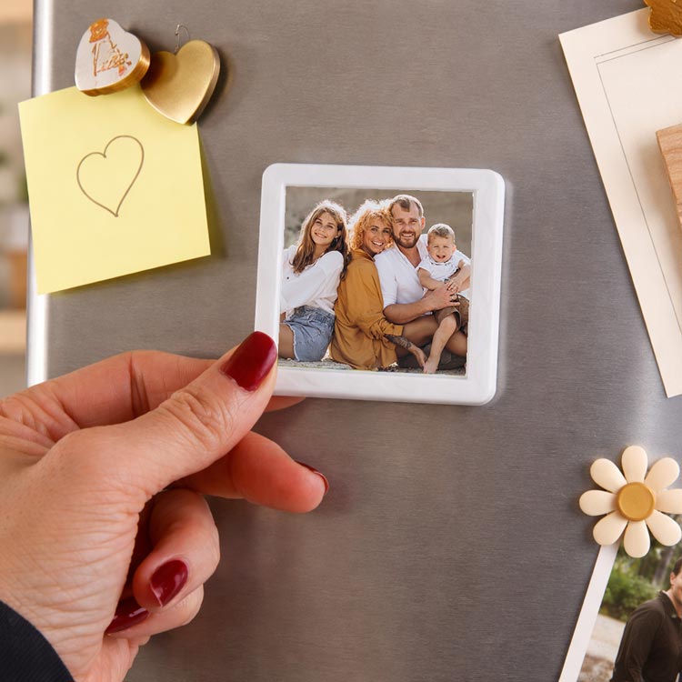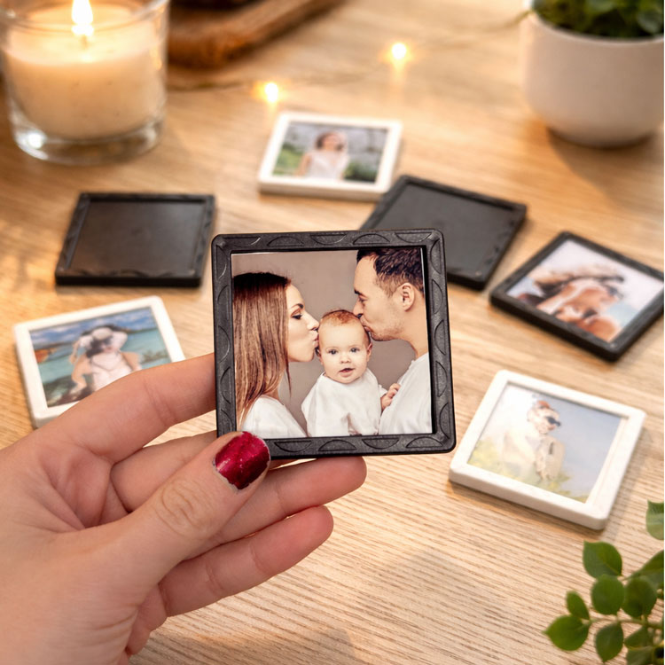 Mini plastik kare çerçeveler siyah ve beyaz olmak üzere iki renk seçeneğine sahiptir. İsteğe bağlı olarak ayrıca satın alabileceğiniz magnetler sayesinde bu çerçeveleri buzdolaplarında kullanabilirsiniz. Bunun yanında, ek olarak sök-tak bantlar satın alarak duvarlarınızda fotoğraf çerçevesi olarak da değerlendirilebilir. ekstra satın alacağınız yaka iğnesi sayesinde yaka kartı olarakta kullanabilirsiniz.