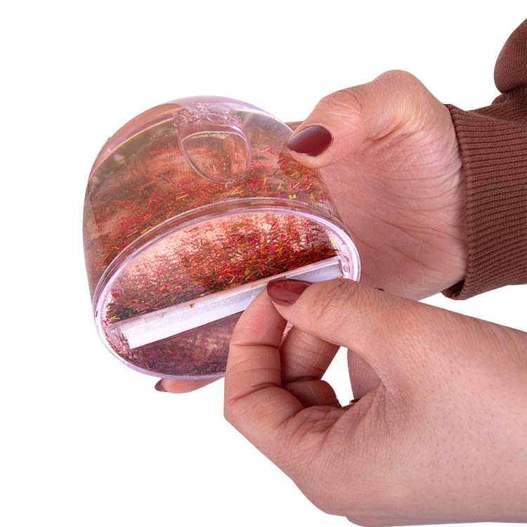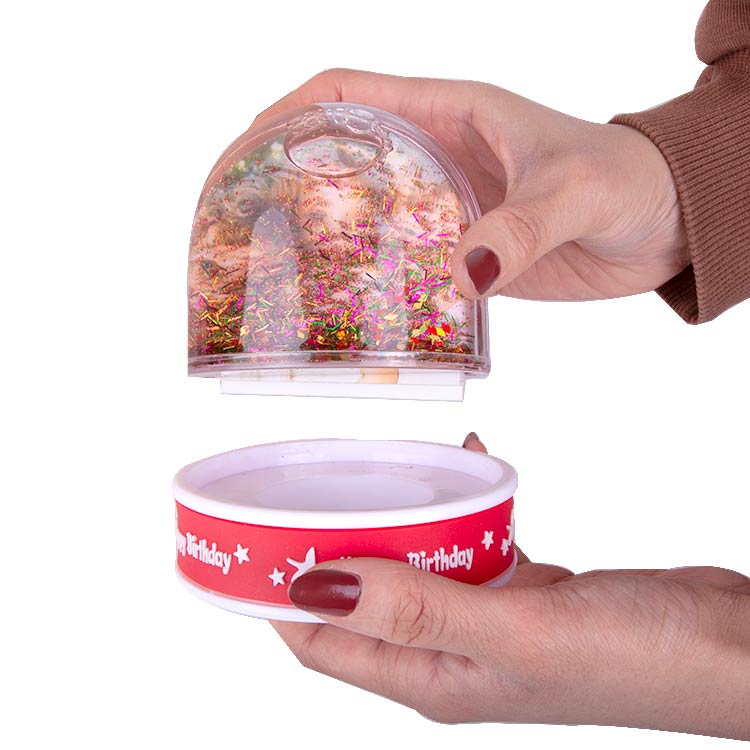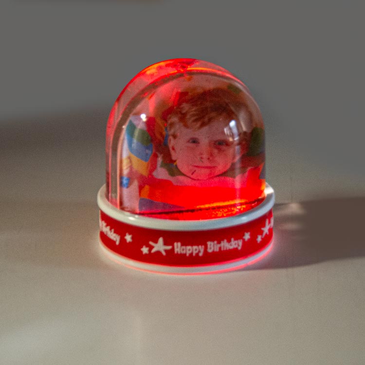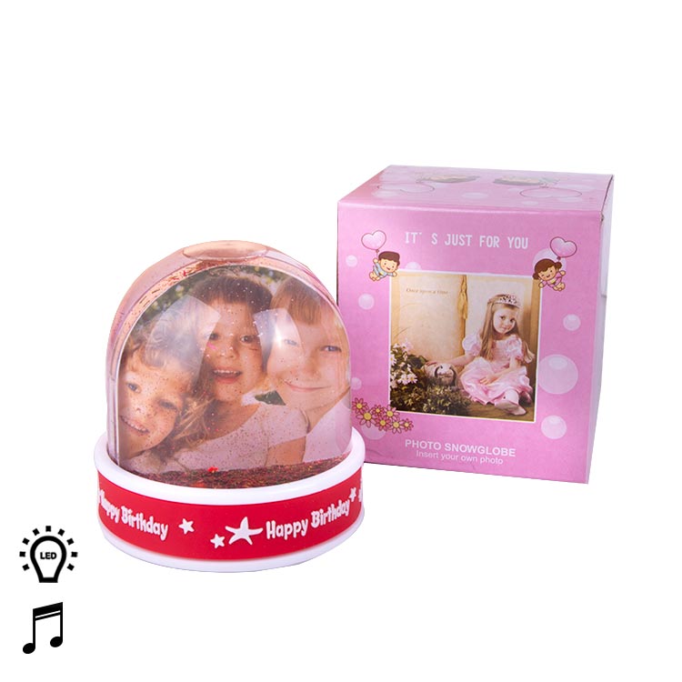 Müzik eşliğinde led ışıkları yanan, içerisine 6x7 cm 2 adet fotoğraf eklenebilen, happy birthday yazı desenli hediyelik fotoğraflı kar küresi.
