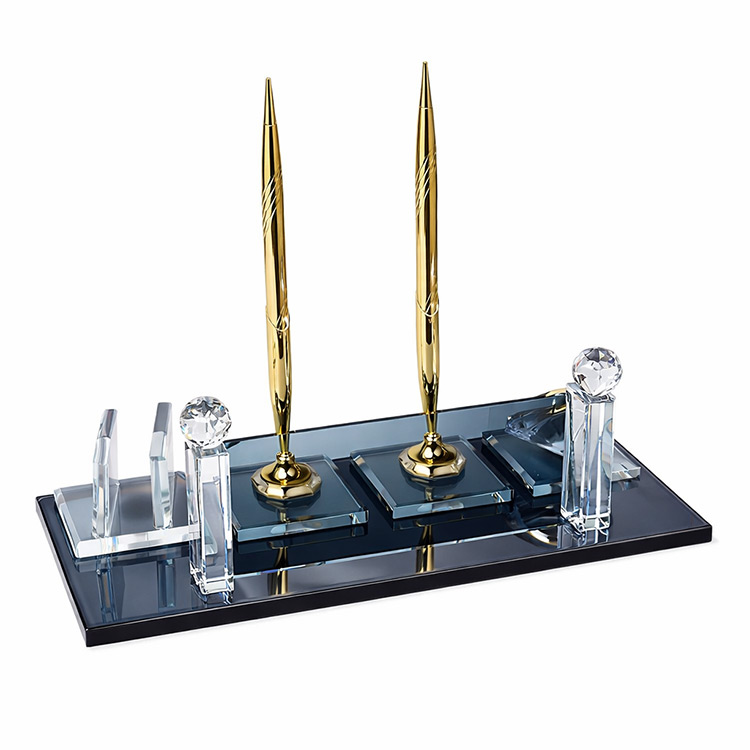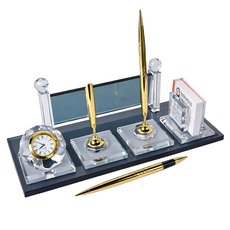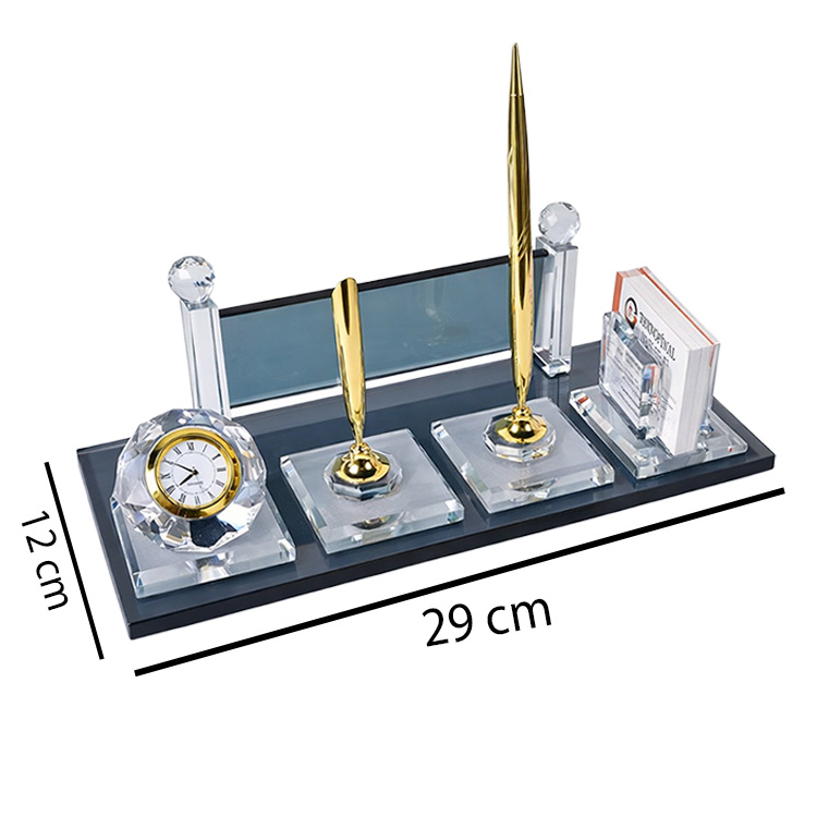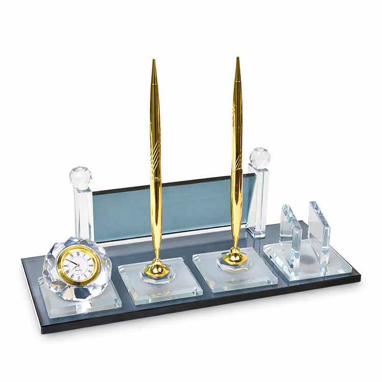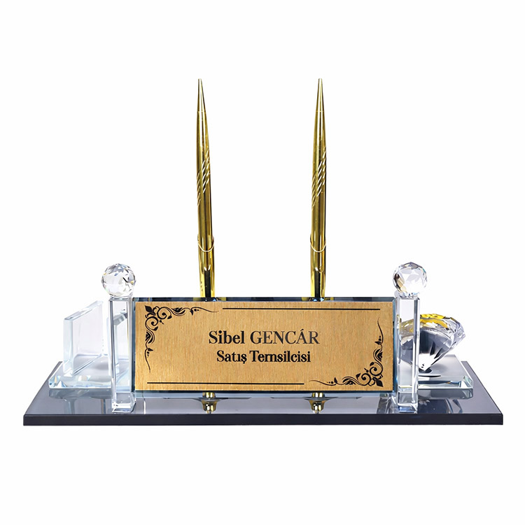 Üzerinde kartvizit alanı, saat ve altın çift kalem aksesuarlarıyla ofislerinizde masanızda eşsiz bir şıklık katabileceğiniz, kaliteli işçiliği ve malzemesiyle uzun yıllar rahatlıkla kullanabileceğiniz modern görünümlü dekoratif kristal masa isimliği.