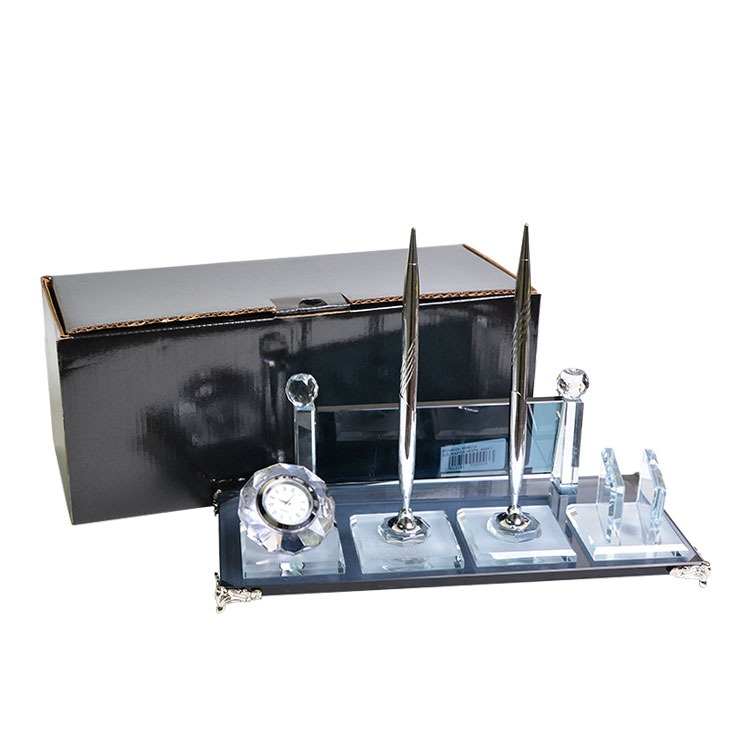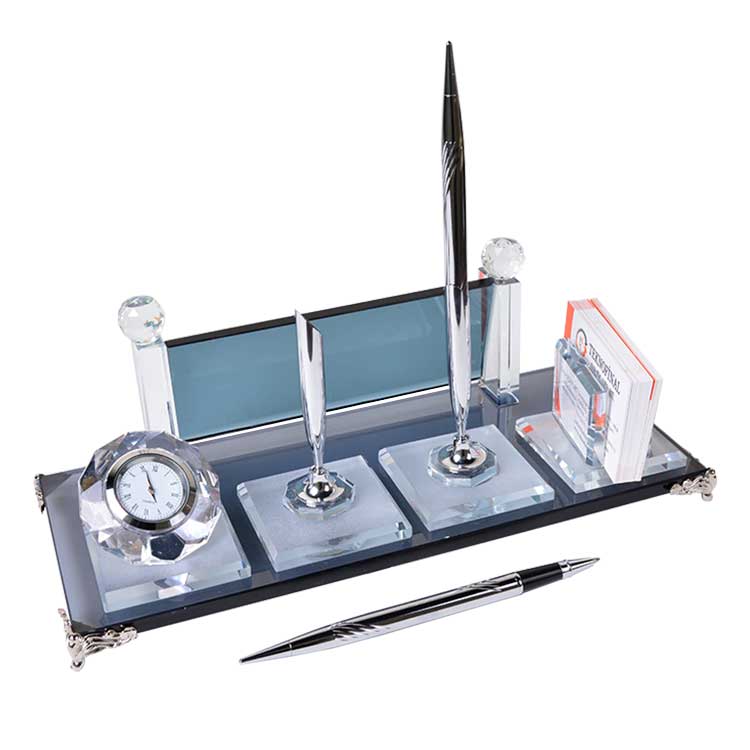 Üzerinde kartvizit, saat ve gümüş kalem aksesuarlarıyla ofislerinizde masanızda eşsiz bir şıklık katabileceğiniz, kaliteli işçiliği ve malzemesiyle uzun yıllar rahatlıkla kullanabileceğiniz modern görünümlü dekoratif kristal masa isimliği.