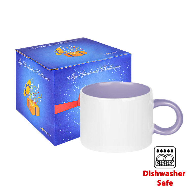Kutulu olarak satılan hem süblimasyon hem de lazer baskıya uygun, toptan porselen lila motto kutulu fincan.
