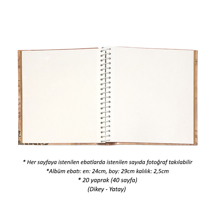 2 farklı deseni bulunan, 20 yaprak 24x29cm ebatlarında ekonomik yapışkanlı fotoğraf albümü.