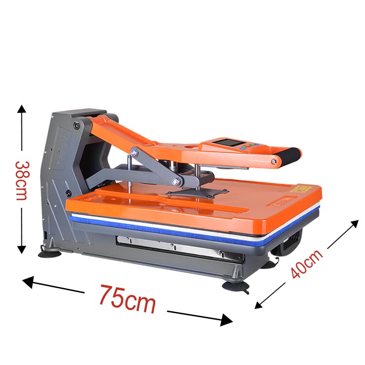 40x50cm boyutlarında, A3 ebatlarında Dtf ve süblimasyon tüm düz yüzeyli baskı işlemlerinizi gerçekleştirebileceğiniz, ray sistemli, yarı otomatik profesyonel düz pres ısı transfer baskı makinesi.