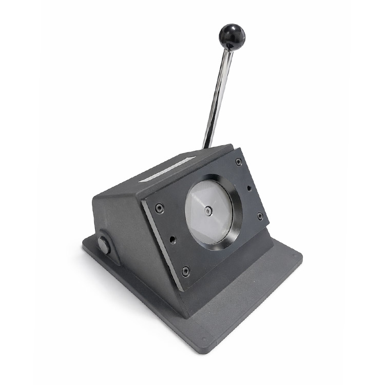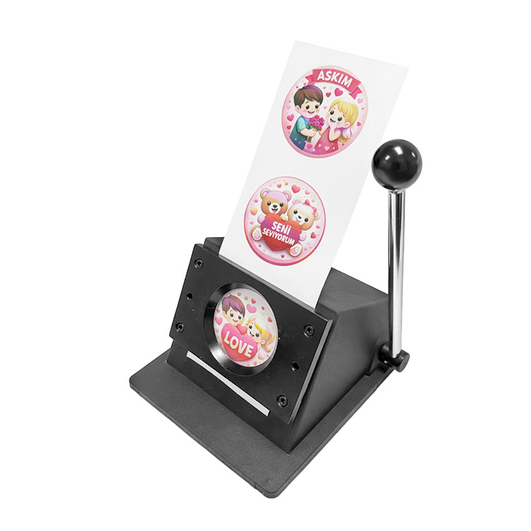 Buton rozet üretiminde, baskısı yapılmış kağıtların dairesel olarak kesilmesini sağlayan, toptan yuvarlak buton rozet kesim giyotini