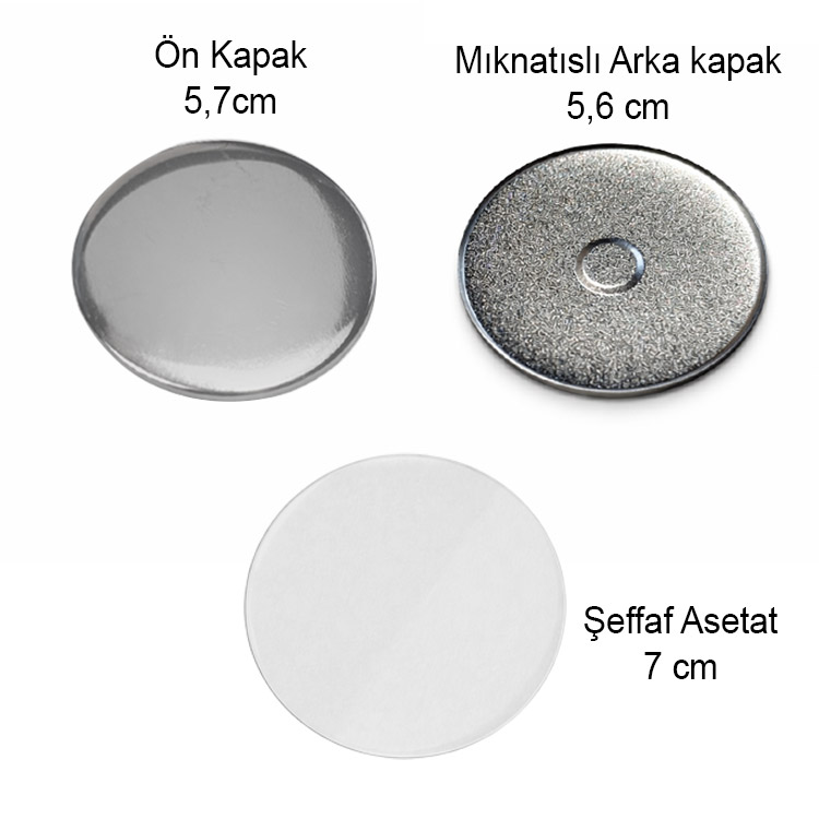 Rozet ön kapağı, magnetli alt kapağı ve şeffaf asetat olmak üzere üç parça set gönderilmektedir. Ürünler demonte halde gönderilmektedir. Buton rozet makinesini kullanarak parçaları kolayca birleştirebilir ve pratik bir şekilde rozetleri monte edebilir. Basımı son derece kolay ve pratiktir. Normal a4 kağıda aldığınız çıktılar ile baskı yapabilirsiniz.