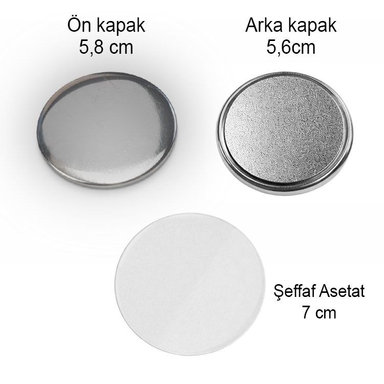 Rozet ön kapağı, alt kapağı ve şeffaf asetat olmak üzere üç parça set gönderilmektedir. Ürünler demonte halde gönderilmektedir. Buton rozet makinesini kullanarak parçaları kolayca birleştirebilir ve pratik bir şekilde rozetleri monte edebilir. Basımı son derece kolay ve pratiktir. Normal a4 kağıda aldığınız çıktılar ile baskı yapabilirsiniz.